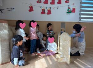 「うさぎ野原のクリスマス」は保育士の真似をしながらうさぎになりきってぴょんぴょん跳んで楽しんでいましたよ☺️