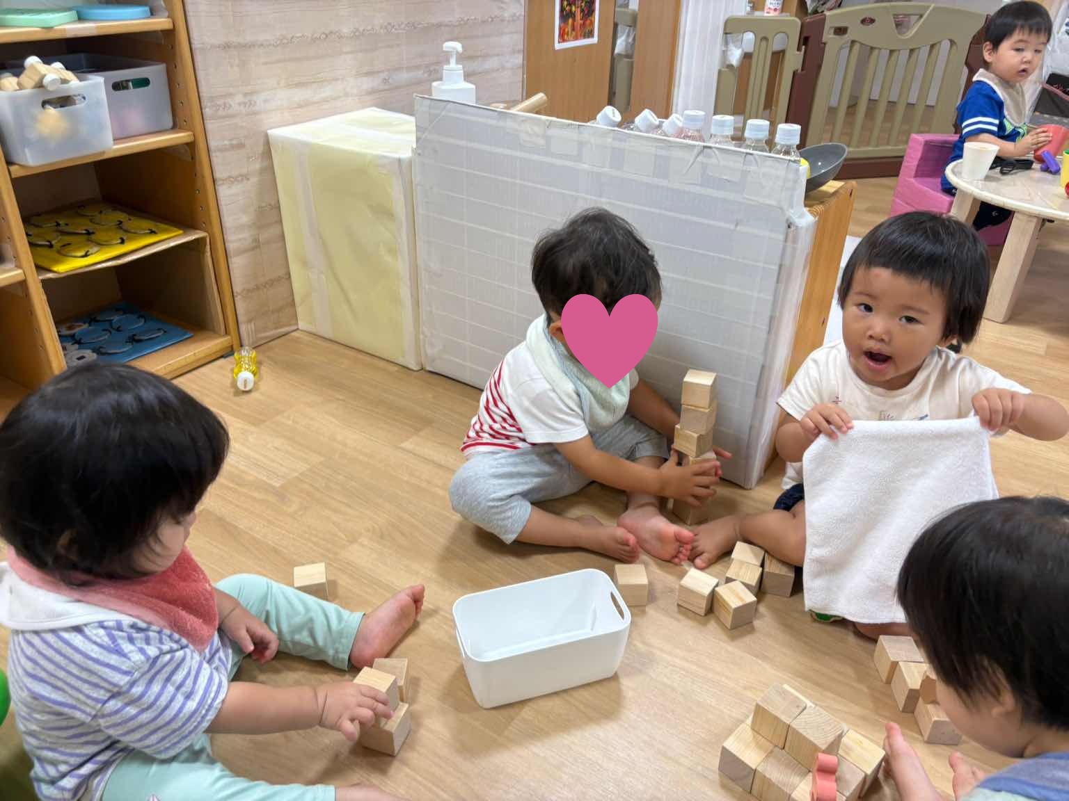 最近、いろんなものを積む姿があったので、柔らかいつみきの他に、新しく木のつみきを出してみました☺️