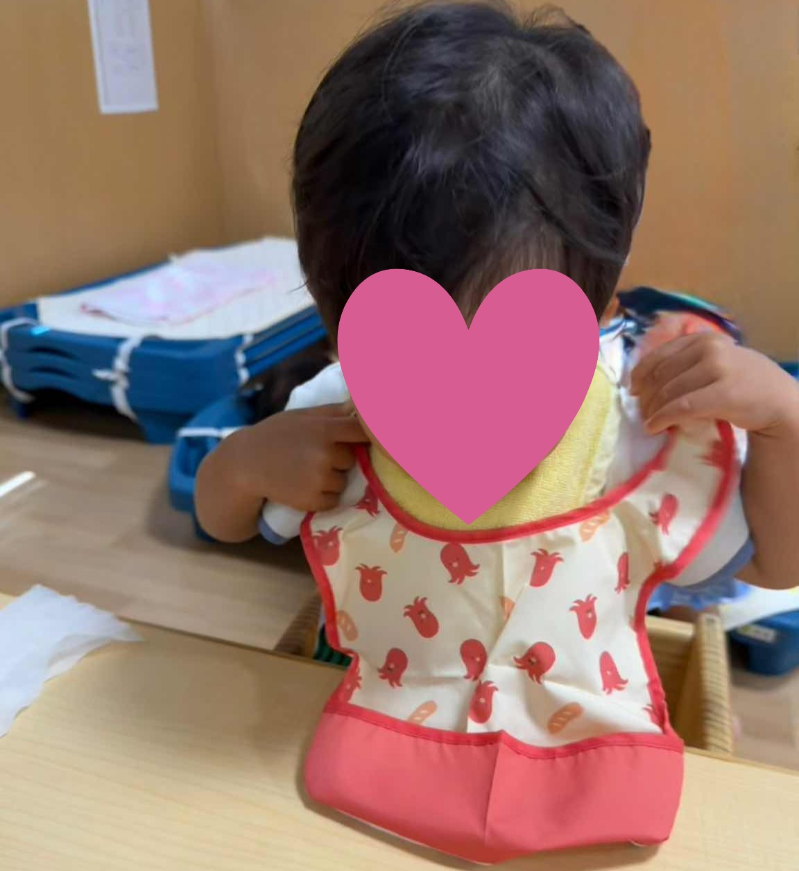 そうする事で、写真のお友だちのように自分で持ち、ゴムを伸ばしながら頭からかぶることができます✨