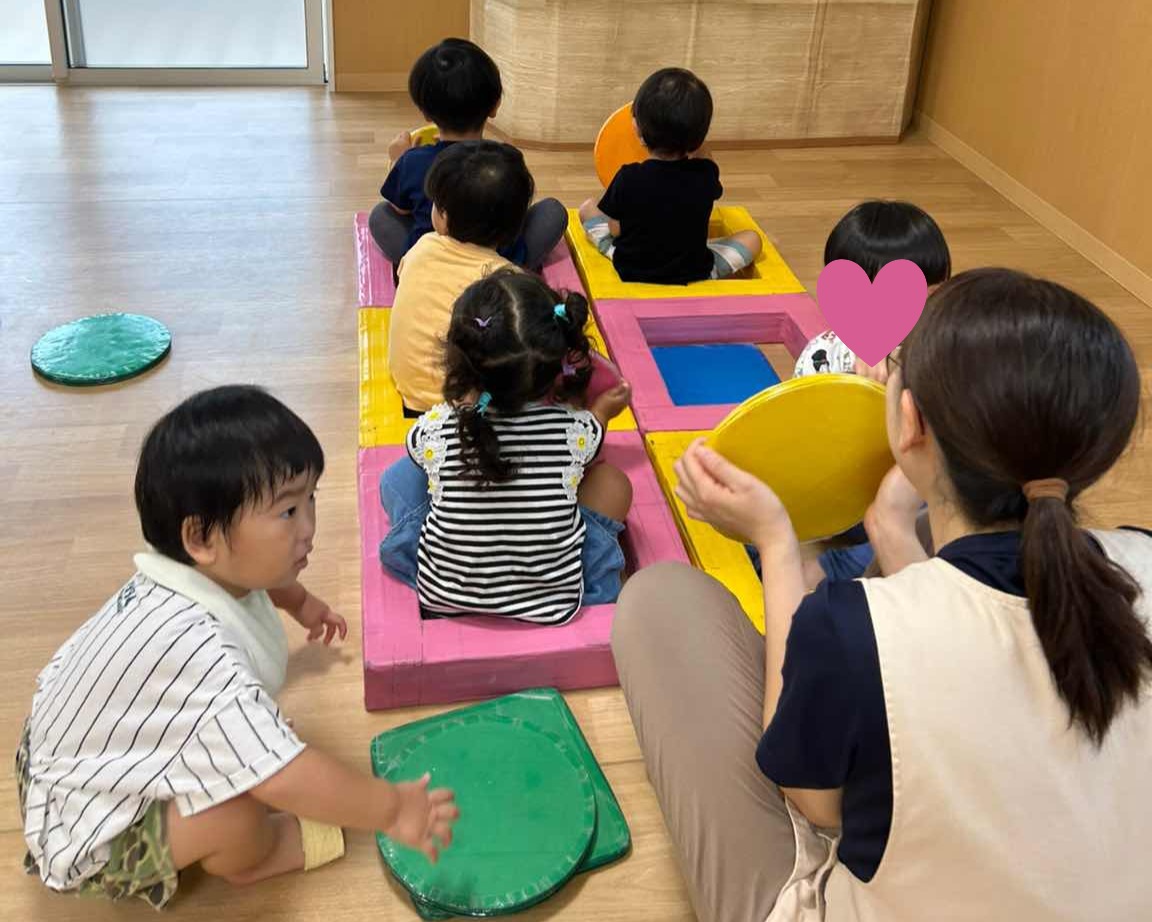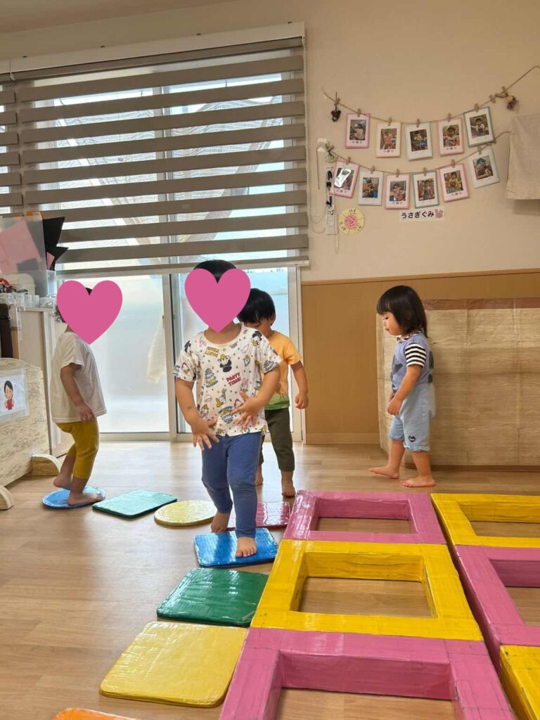 もう一つの遊びは、丸板と四角板を自分達で並べてその上を歩いていました!一つの遊びを友達と一緒に遊ぶ姿が多く見られるようになり、成長を感じ嬉しく思います❤️
