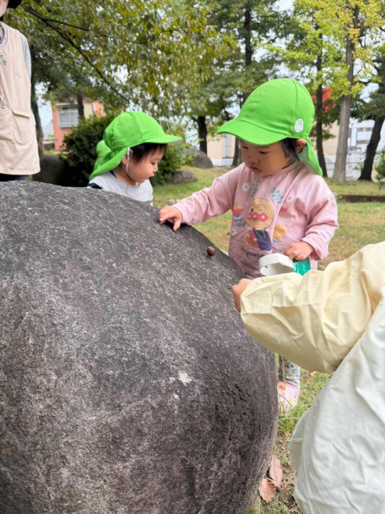 昨日も楽しんだ、大きな岩からどんぐりを転がすことも楽しんでいました☺️1人の子が転がしだすと、思い出したかのようにたくさん集まってきて、岩からどんぐりをコロコロ〜😊