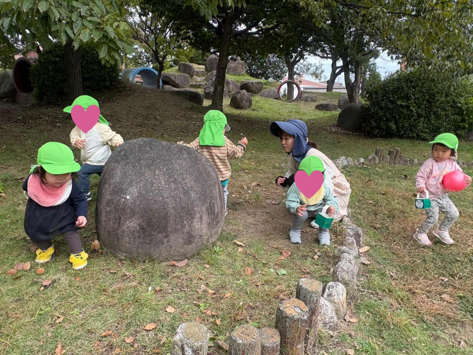 昨日も楽しんだ、大きな岩からどんぐりを転がすことも楽しんでいました☺️1人の子が転がしだすと、思い出したかのようにたくさん集まってきて、岩からどんぐりをコロコロ〜😊