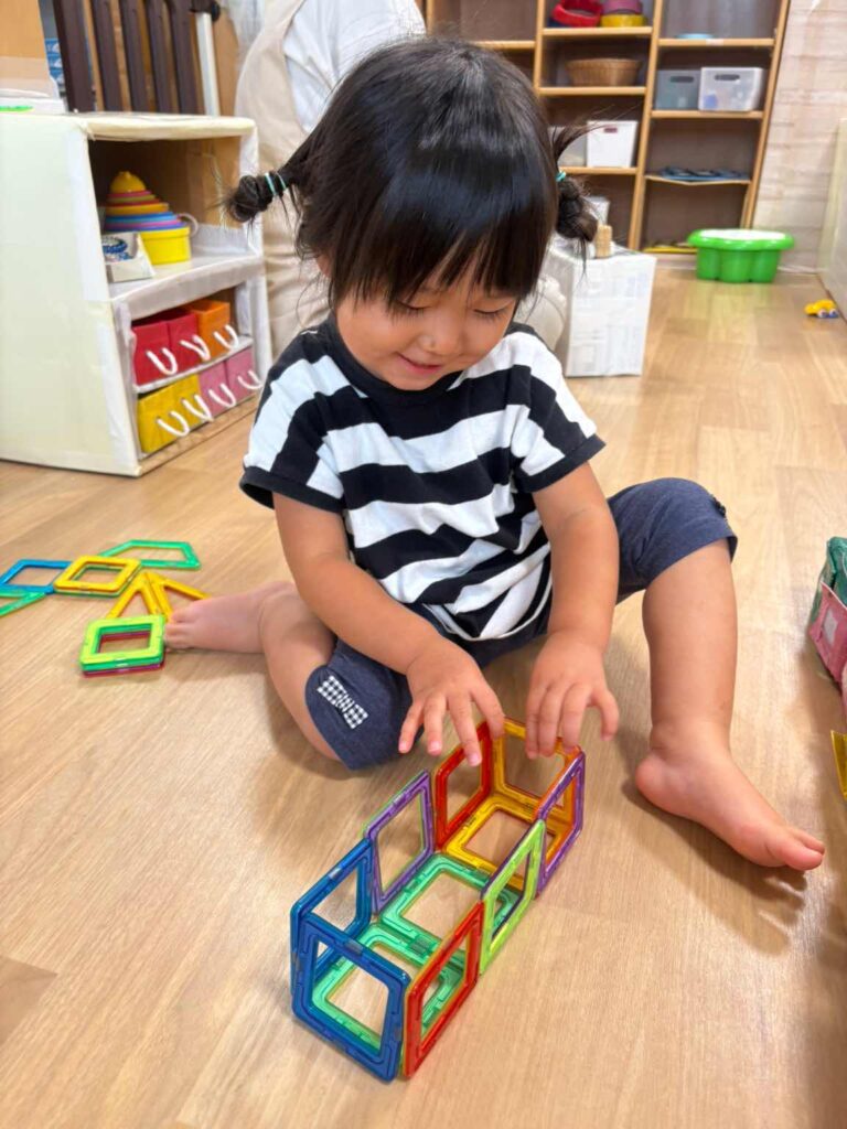 マグフォーマーは、くっつける時に指先を使ったり、いろんな形や色があるので、形や色を覚えたり、立体のものを作ることによって空間認識力が育ったり…いろんなことが育つおもちゃなので、たくさん一緒に遊びたいと思います☺️✨