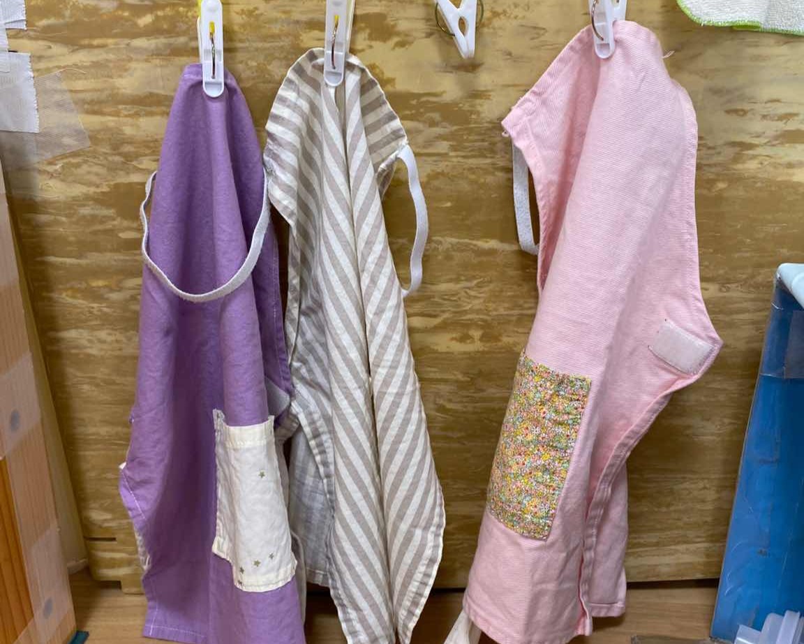 エプロンは1人で付けられるように首の部分はゴム紐、お腹の紐はマジックテープで付けられるようにしています👍🏻 ̖́-