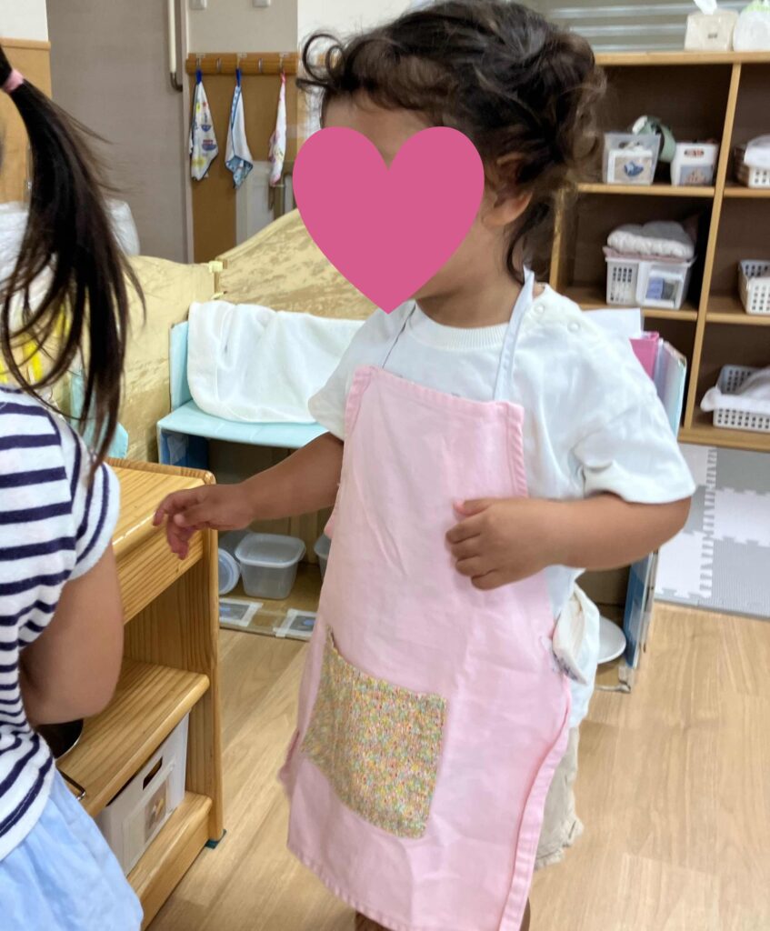 新しい玩具を見つけるのが得意なうさぎ組さんなので、エプロンをすぐに見つけて興味津々でしたよ😉